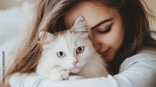 woman, holding, white, cat, blue, eye, cute, pet, animal, domestic, smiling, looking, 1, person, closeup, portrait, woman, indoor, kitten, caucasian, lifestyle, beauty, animal, adult, relaxation, happiness, cheerful, young, love, felino, fur, friendship, small, lying, female, mammal, long, hair, brown, playful, fun, home, interior, whisker, camera, comfortable, embracing, nature