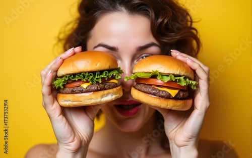A woman holds two hamburgers in front of her face, possibly hiding or admiring them. High quality