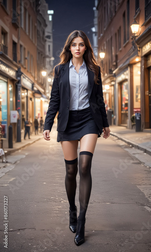 woman, walking, street, city, night, blazer, skirt, black, boot, stocking, leg, fashion, model, urban, evening, pose, style, female, life, light, portrait, full, body, outfit, night time, city landscape, downtown, city landscape, trendy, modern, chic, stylish, footwear, shot, long, hair, brown, fashionable, photoshoot, scene, lifestyle, idea, shoot, clothing, inspiration, look, trend