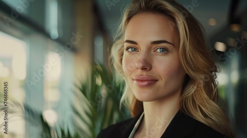 A woman in a black jacket looking directly at the camera. Suitable for a variety of concepts and themes