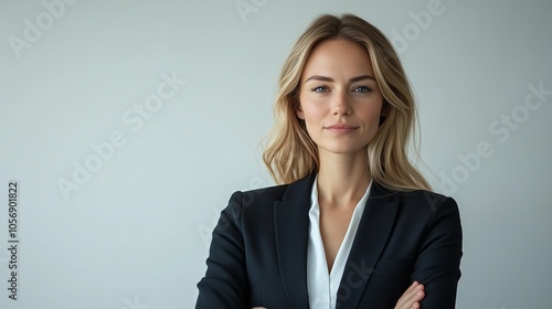 A woman in a business suit is standing with her arms crossed and looking directly at the camera. Concept of confidence and professionalism, as the woman is dressed in a formal business attire