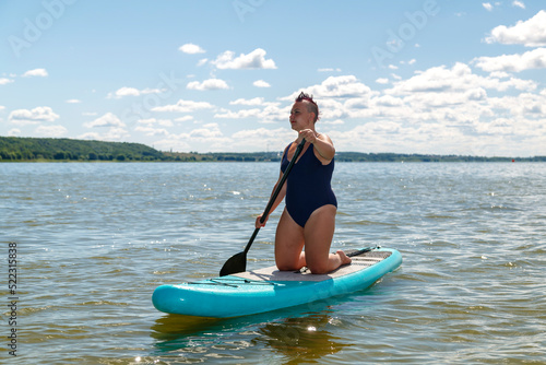 a woman in a closed swimsuit with kneeling on a SUP board with a paddle floats on the water against the blue sky.