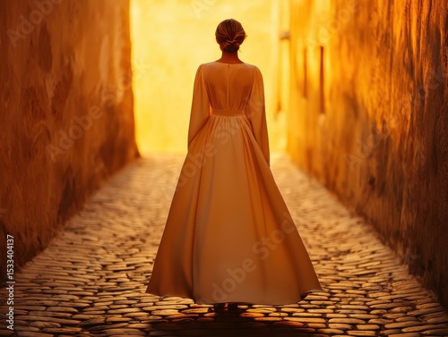 A woman in a flowing dress walks through a sunlit cobblestone alley.