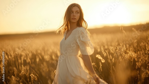 woman, dress, field, sunset, gold, serene, beauty, nature, sunlight, dreamy, fashion, landscape, portrait, summer, elegance, hair, photo, motion, calmness, blossom, lifestyle, freedom, warmth, outdoors, emotion, pastoral, artistic, style, romantic, charming, soft, aethereal, radiant, environment, exploration, joy, peaceful, majestic, feminine, scenic, idylli, harmony, romance, allure, countryside, grace, moment