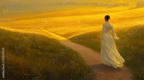 woman, dress, path, field, sunset, landscape, nature, beauty, serenity, journey, sunlight, grass, flower, horizon, calmness, exploration, freedom, peace, rural, scenery, outdoors, walking, solitude, warmth, environment, sky, countryside, gold, blooming, idylli, scene, silhouette, meandering, soft, bright, pastoral, elegant, motion, lifestyle, adventure, harmony, escape, calm, inspiration, visual, art