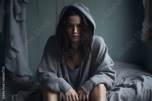 woman, hoodie, sitting, bed, relaxation, comfort, leisure, calm, peaceful, alone, solitude, introspection, meditation, mindfulness, mental health, wellness, contemplation, serenity, calmness, rest, sleep, nap, dream, bedchamber, home, cosy, casual attire, fashion, style, urban, modern, technology, ai, automation, innovation