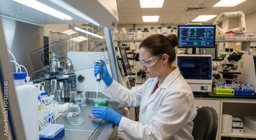A woman in a lab coat working in a laboratory with a computer monitor, a microscope, and various laboratory equipment.