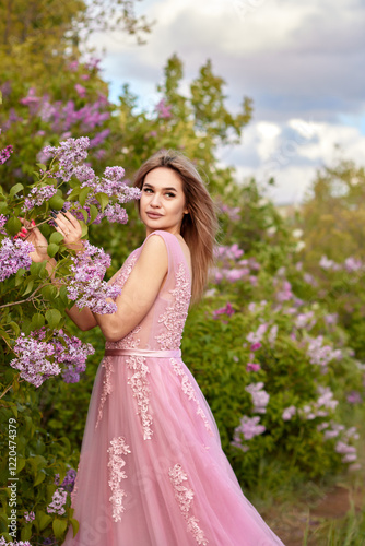 woman, pink, dress, standing, field, purple, flower, beauty, female, young, nature, portrait, model, person, fashion, caucasian, cute, garden, adult, pretty, blossom, background, lady, romantic, park, green, face, lifestyle, attractive, smiling, fresh, long, bloom, sun, outside, posing, floral, elegant, 1, day, sunset, make-up, next, beautiful, lilac, bush, early, sunny