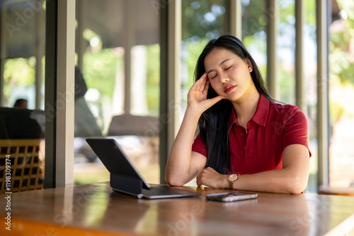 woman, red, shirt, sitting, table, tablet, mobile phone, sleepy, forehead, person, female, businesswoman, rubbing, phone, business, computer, office, laptop, young, adult, working, job, manager, problem, professional, desk, stress, beautiful, stressed, employee, portrait, workplace, technology, upset, cephalalgia, asian, men at work, white, modern, unhappy, frustrated, occupation, sad, pain, worried, depressed, looking, head, 1