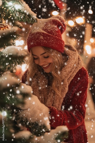 christmas, new, year, snow, ornament, woman, red, sweater, festive, hat, tree, holiday, admiration, decoration, celebration, winter, indoor, cosy, joyful, seasonal, tradition, white, green, ornament, light, merry, cheerful, warm, spirit, december, attire, decor, wonderland, family, season, colours, daytime, background, banner, poster, soft, christmas