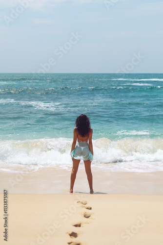 A woman in a white bikini and transparent pareo skirt stands on the beach, facing the ocean with footprints in the sand behind her. Ideal for travel, fashion, and summer campaigns that emphasize