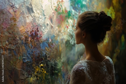 A woman in a white lace dress views a textured, colorful piece of art, her presence adding an air of elegance and refinement to the gallery's creative environment.
