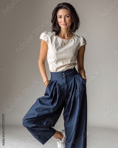 woman, white, top, blue, pant, posing, picture, fashion, style, trend, clothing, outfit, jean, casual attire, model, elegant, chic, trousers, inspiration, blouse, 1, leg, crossed, over, young, studio, neutral, background, short, sleeve, round, neckline, paired, high, waistline, belt, waist, sneaker, gold, bracelet, wrist, dark, hair, loose, wave