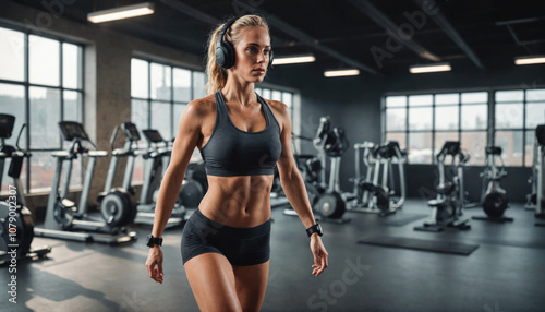 A woman in black workout clothes walks through a gym, wearing headphones