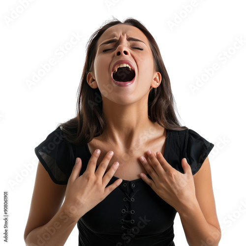 A woman in distress, clutching her chest and shouting, her face expressing intense emotion, possibly indicating pain, anxiety, or a call for help.
