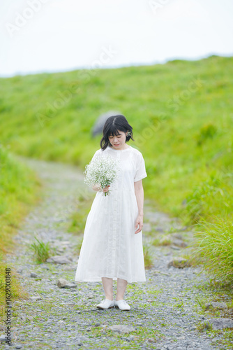 A woman in her thirties with midlength hair in a white dress holds baby breath while standing alone on a mountain trail under open sky, no buildings. Nagano Prefecture, Kirigamine, Japan, summer.