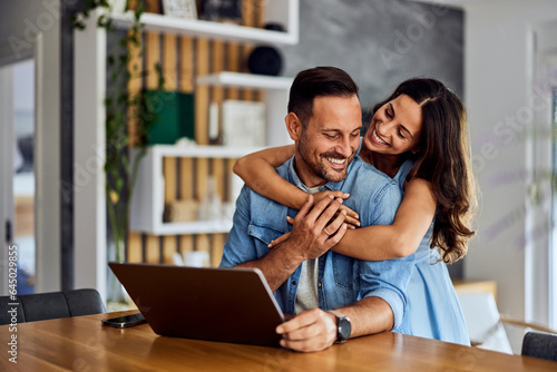 woman, hugging, freelance, boyfriend, back, working, laptop, smiling, sitting, freelancer, love, online, workplace, work, wooden table, female, typing, technology, happy, networking, home, male, loving, couple, job, indoor, girlfriend, hug, home office, man