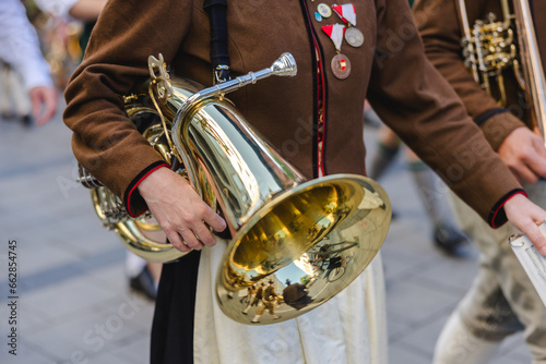woman, bavaria, bavarian, german, gold, metal, isolated, closeup, closeup, band, brass band, musician, horn, trumpet, wind instrument, instrument, lederhosen, music, oktoberfest, munich, traditional, tradition, man
