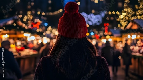 A woman in winter with her back to the camera, standing at an outdoor Christmas market decorated for the holiday season