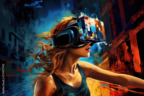 A woman is captured in this painting wearing a virtual reality headset, Reality and virtual reality merging in an abstract representation, AI Generated