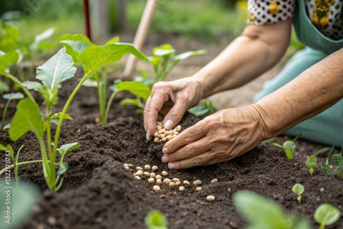 A woman is currently kneeling down in a beautiful garden while holding various seeds in her hands