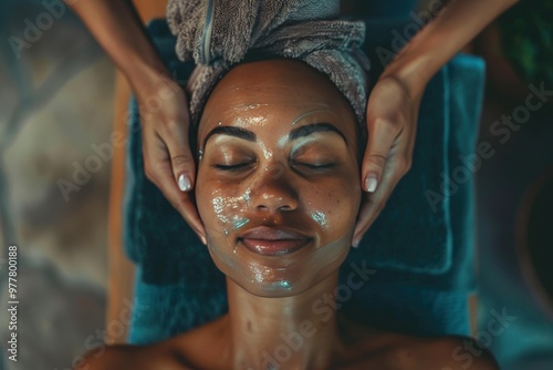 A woman is getting a facial treatment with a white mask on her face, generative ai image