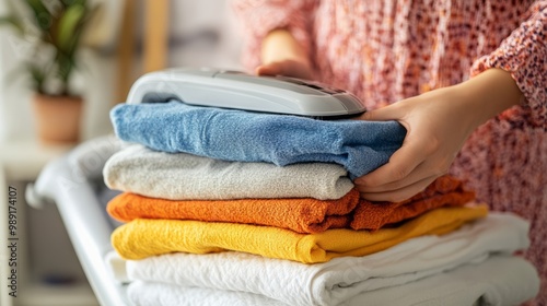 woman, holding, remote, control, front, pile, clothes, clean, top, stack, organizing, folded, process, laundry, textile, domestic, background, cotton, fabric, room, housework, soft, lifestyle, white, female, closeup, home, material, house, heap, washing, household, fresh, concept, hygiene, towel, colours, fashion, garment, modern, work, blue, homemaker, shirt, indoor, sweater, winter, people, design