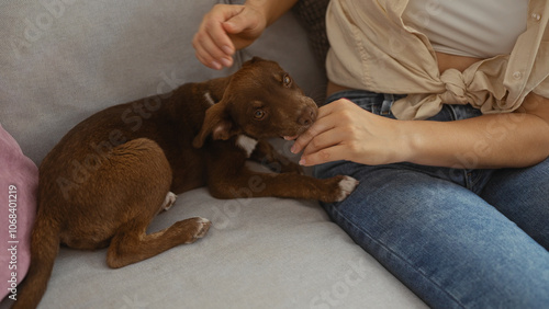 woman, dog, puppy, sofa, indoor, living, room, hand, home, pet, interaction, jean, brown, animal, domestic, casual attire, relaxed, bonding, companion, friendship, care, affection, cosy, female, cuddly, playful, happy, indoor, apartment, comfort, interior, relaxing, love, caring, trust, joy, happiness, warmth, tender, precious, family, adorable, beloved, closeup, lifestyle, homelike, lap, domesticity, resting