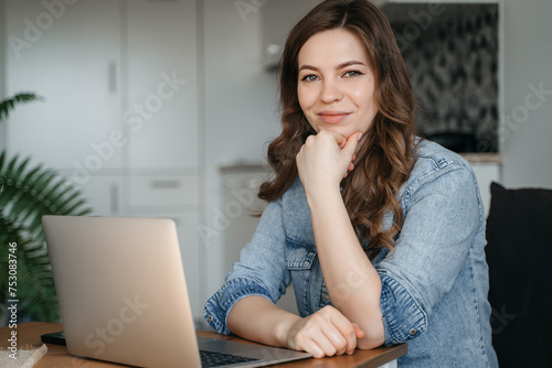 A woman is seated at a table with a laptop computer and a plant, smiling