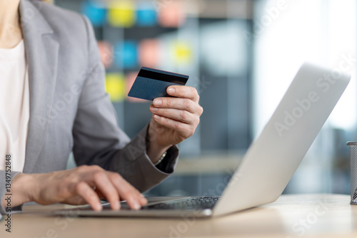 A woman is shopping online using her credit card and laptop in the office, making secure purchases from the comfort of her desk
