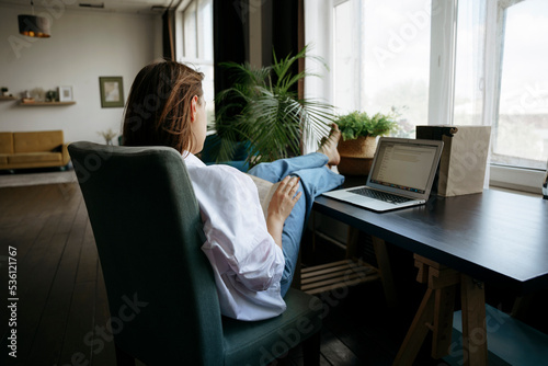 A woman is sitting at a desk in a home office and reading a book, there is a laptop on the table. Time to relax