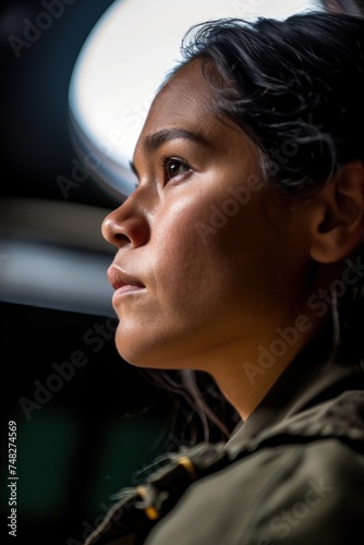 a woman looking up to the side