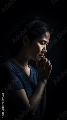 woman, praying, hand, dark, shadow, sorrowful, portrait, face, emotion, religion, belief, faith, hope, despair, spiritual, thoughtful, introspective, contemplation, pray, female, human, person, adult, black, background, photo, studio, art, image, light, sharpened, artistic, style, tone, dramatic