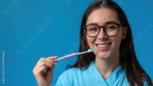 a woman shows a toothbrush, concept for taking good care of your teeth