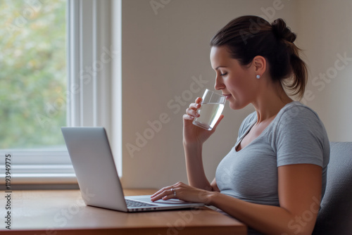 woman, working, laptop, water, drinking, desk, hydratation, productivity, home office, workspace, technology, window, sharpened, healthy lifestyle, casual attire, modern, indoor, serene, light, daytime, calm, relaxed, professional, balance, routine, home, efficient, thoughtful, health, concentration, minimalism, simple, quiet, workplace, natural light, refreshing, mindful, soft light