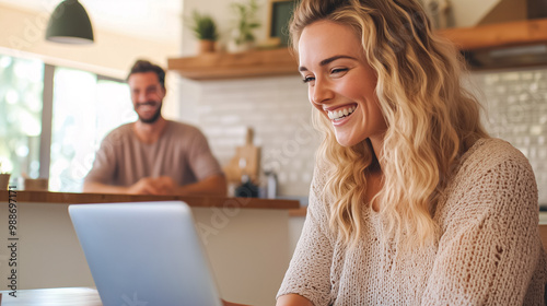 A woman sits with a laptop, smiling as she engages in her work. A man stands in the background, sharing a joyful moment in a bright kitchen
