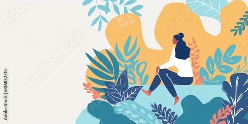 A woman sitting on a rock in a lush green forest. She is wearing a blue shirt and jeans and has her hair in a ponytail. The background is a blur of green leaves and flowers.