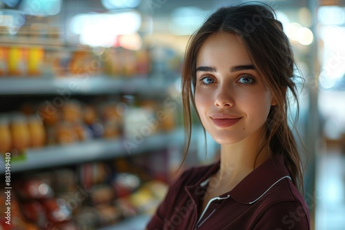 woman, female, smiling, food market, aisle, shopping, shelf, product, food, client, consumer, retail, store, market, supermarket, shopping cart, happy, cheerful, purchase, good, selection, choice, browse, explore, discover, look, glance, gaze, blue eye, brown hair, ponytail, red shirt, background, blur, defocused, head shot, casual attire, everyday, indoor