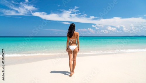 bikini, swimwear, sea, beach, summer, white sand, sandbeach, wave, sky, cloud, sand, nature, tropical, woman, footprint, margin, model, hat, palm tree, sensibility, recreation, mind, travel, vacation