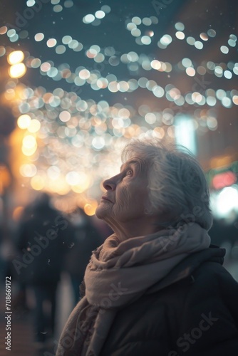 woman, standing, front, christmas, tree, holiday, festive, celebration, decoration, light, ornament, present, winter, seasonal, joy, happiness, family, tradition, cosy, home, wonderland