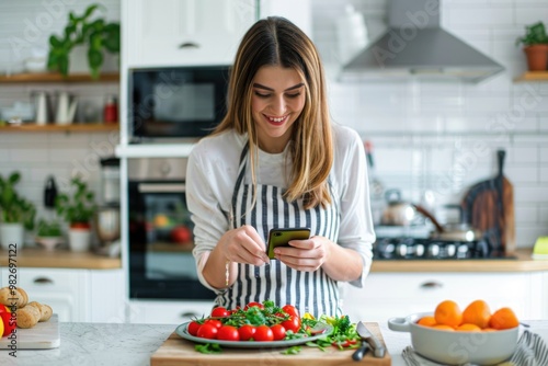 woman, person, female, human, smartphone, mobile, phone, kitchen, domestic, home, interior, room, space, appliance, technology, modern, contemporary, lifestyle, daily, routine, morning, afternoon, evening, mealtime, communication, connection