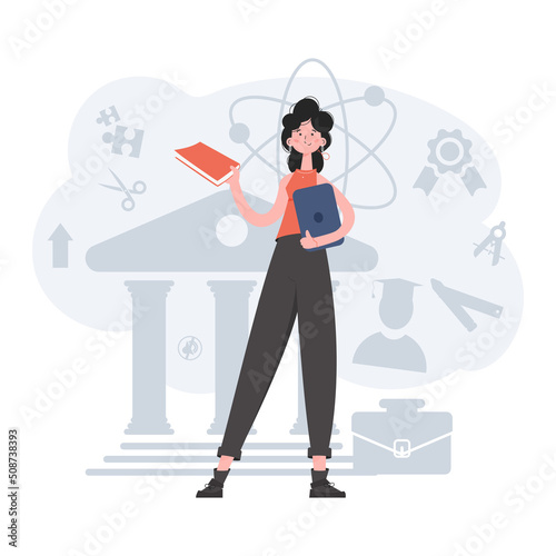 A woman stands in full growth with a book and a tablet. Online school. Element for presentations, sites.