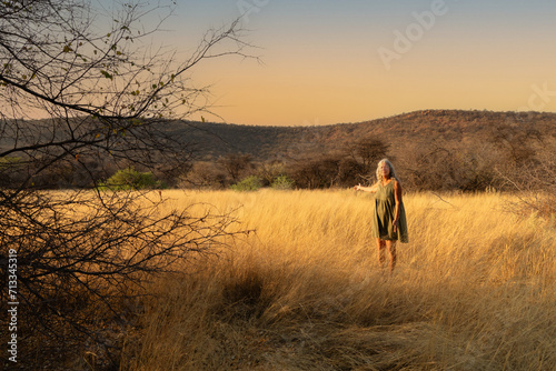 A woman stands in grassland that glows golden in the early morning sun near Mount Etjo in central Namibia.