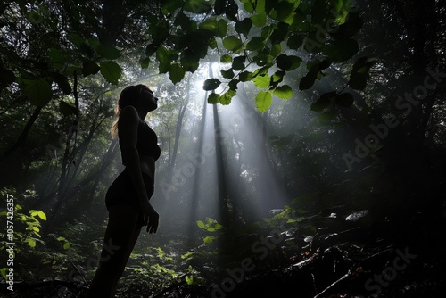 forest, silhouette, woman, nature, sunlight, tree, misty, peaceful, serene, solitude, outdoors, meditation, calmness, introspection, green leaf, spirituality, natural beauty, timberland, wilderness, scenic, morning light, contemplation, calm, mist, harmony, fresh air, calmness, environmentally friendly