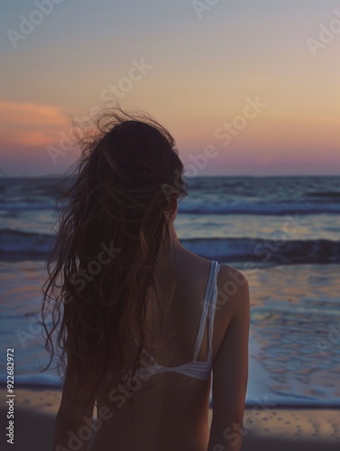 A woman stands on the beach at sunset, facing away from the camera. The warm glow of the setting sun illuminates the ocean horizon and creates a serene atmosphere.