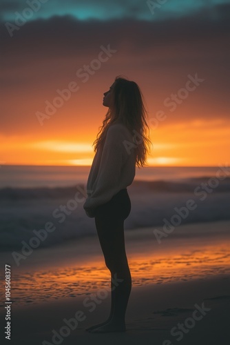 A woman stands tall, silhouetted against a beach sunset’s vibrant colors.