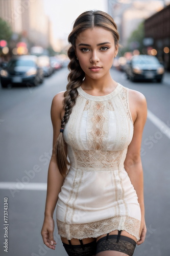 A woman stands with poise in a stylish white dress, stocking and high heels, her hair braided over one shoulder, adorned with a striking setting of an arcade-style corridor