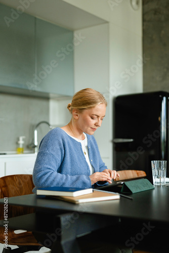 business, businesswoman, day, entrepreneur, executive, home, indoor, cyberspace, kitchen, notebook, online, remote, to sit, smile, table, tablet, technology, typing, use, work, workplace