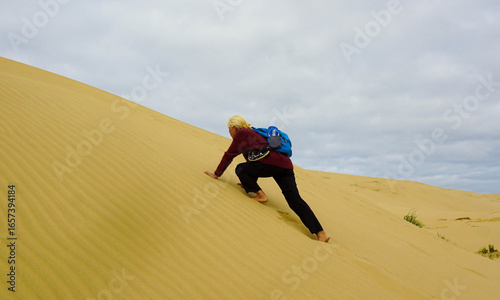 A woman walking on the Giant Sand Dunes, Cape Reinga, New Zealand.