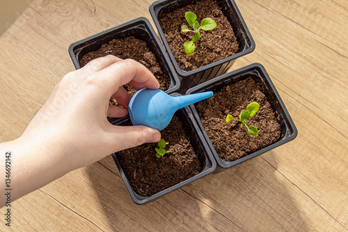 A woman waters petunia seedlings with a rubber syringe. Drip irrigation